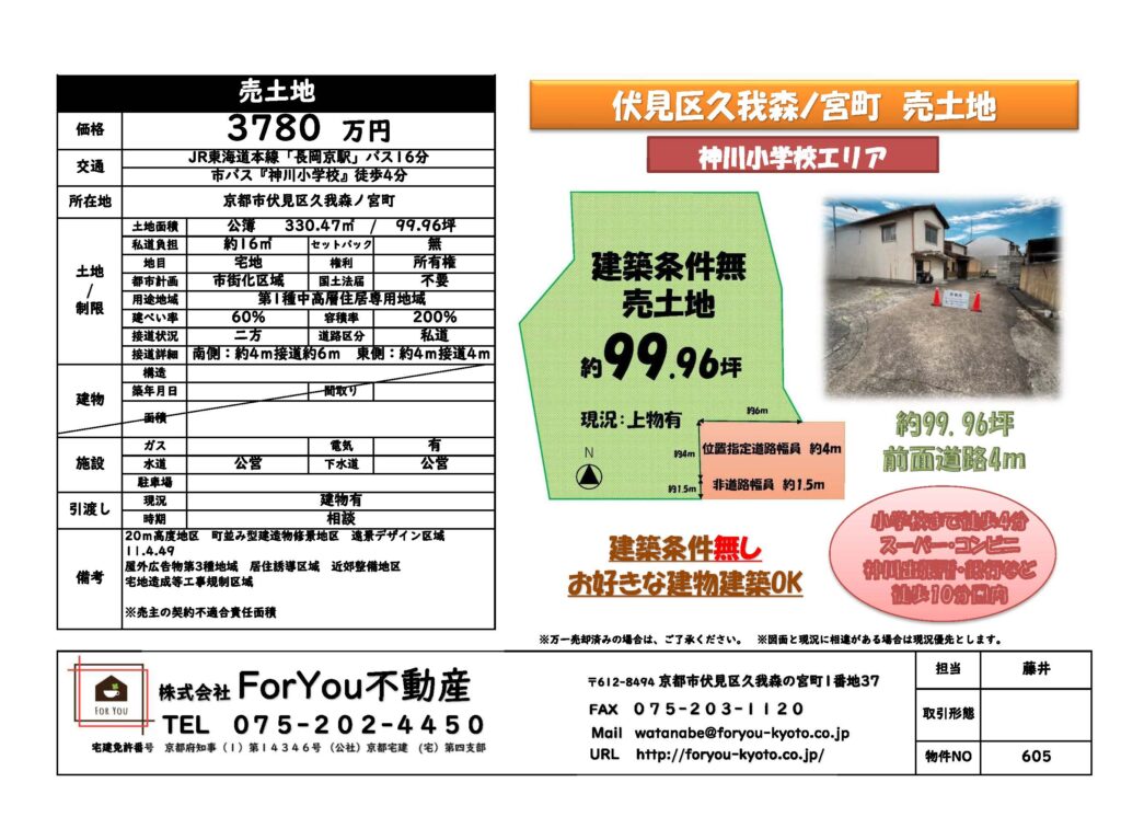 #売土地 #伏見区 #久我森ノ宮町 #建築条件なし #事業用物件 #土地活用 #住居兼事務所 #ガレージハウス #大型ガレージ #広い敷地 #京都不動産